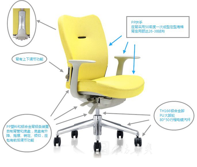 A:用TH166PP扶手,TH166鋁合金腳,PU大腳輪,80*50行程電鍍汽桿。背有上下調(diào)